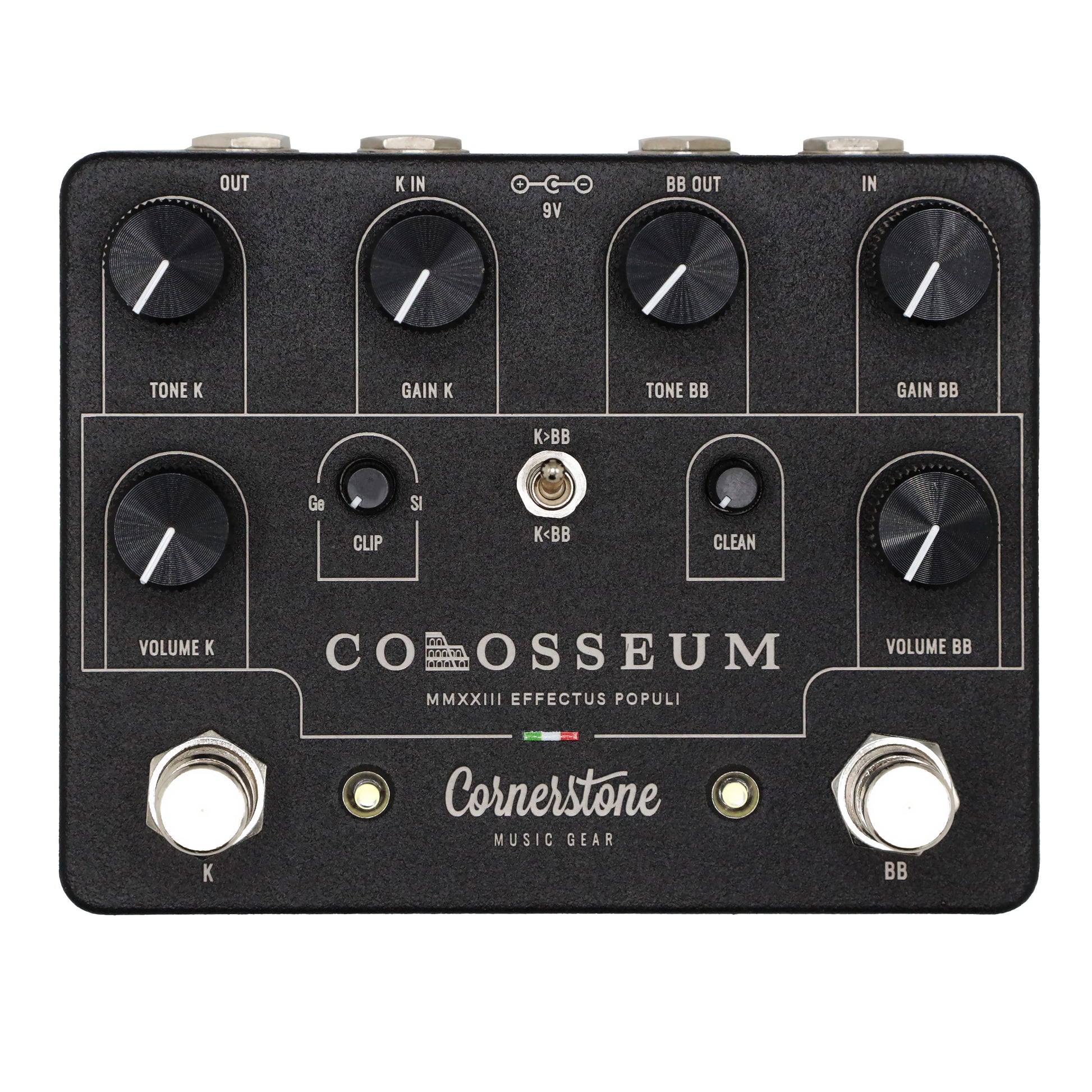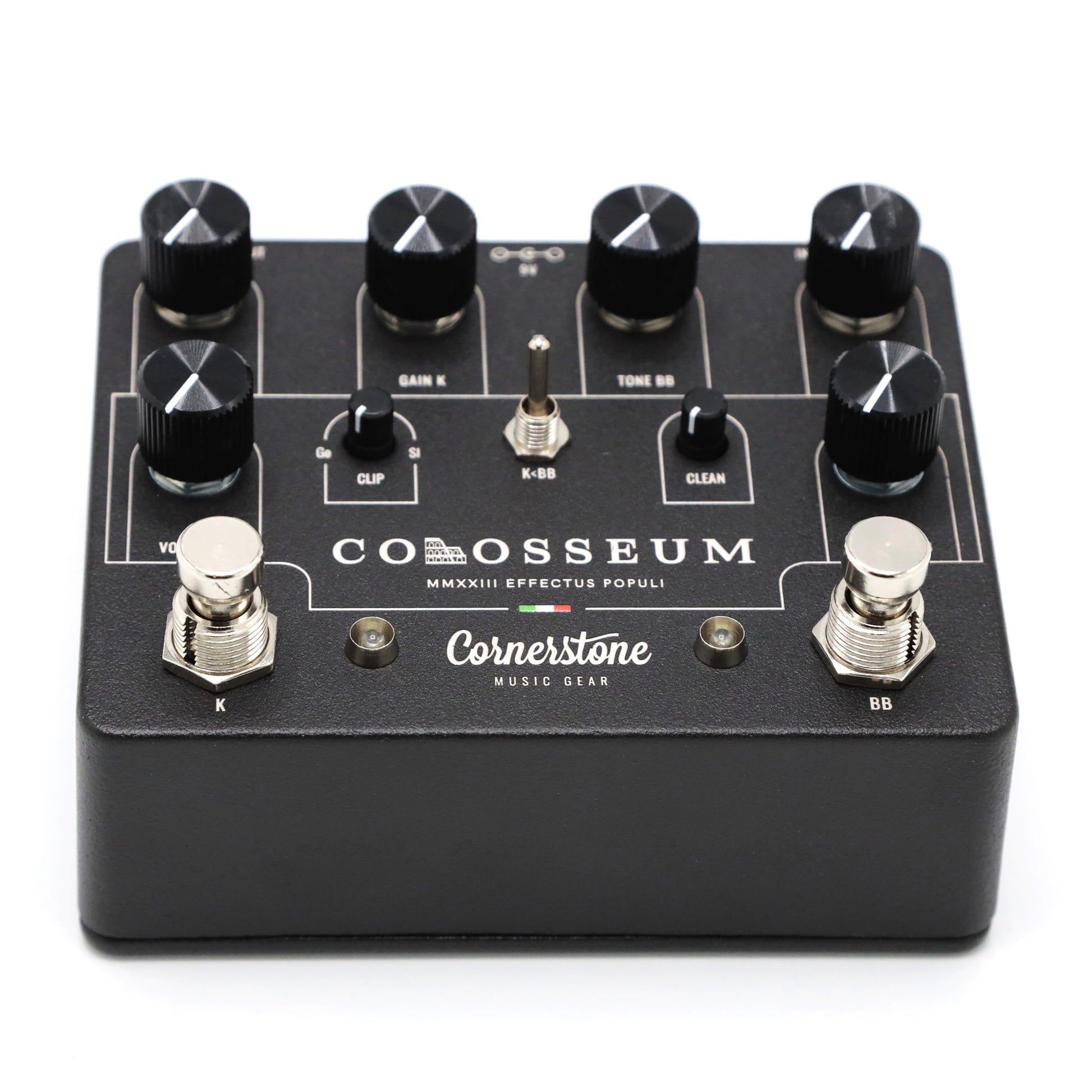 Experience the groundbreaking Colosseum, the first-ever Community Pedal from Cornerstone. Meticulously designed with the input of their devoted followers and the Cornerstone Community, this dual overdrive pedal combines the best elements of the Blues Breaker and Klon circuits. The Colosseum offers an enhanced Blues Breaker side with no clipping diodes, a signature Clean control, and outstanding touch sensitivity. On the Klon side, explore the legendary sound with a twist - Germanium diodes, hand-selected silicon diodes, and the innovative clip blender. With versatile connectivity options and a toggle switch for seamless channel switching, the Colosseum is a must-have for any discerning guitarist. Rediscover classic ODs and unlock new tonal possibilities with the Colosseum.