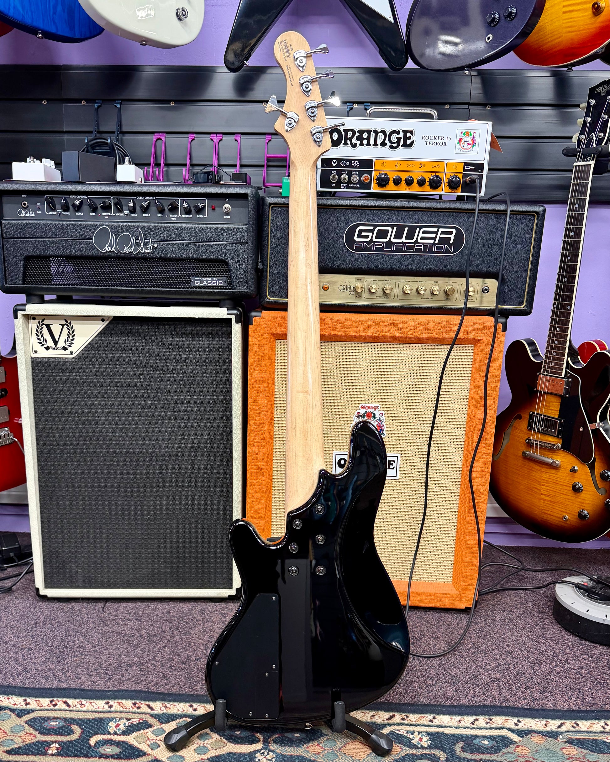 This bass is pre-owned in excellent condition, and includes the original Cort gigbag. The pickguard has been modified with a carbon vinyl and the knobs have been swapped out to make the preamp distinct from the volume controls.