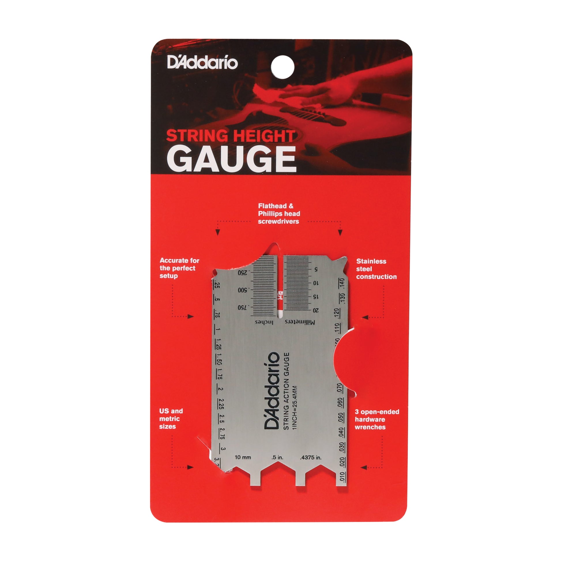 The D’Addario String Height Gauge is an all-in-one tool to help you set up your guitar with the highest possible level of precision. Made of stainless steel, this durable tool helps you easily measure the height of your strings and pickups, neck relief, and other critical measurements. With access to these measurements all in one place, getting your guitar into its best playing form has never been easier.