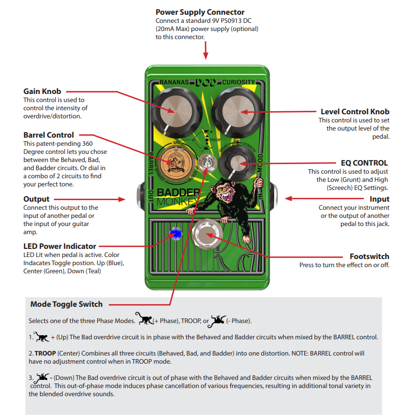 The long-awaited return of the Bad Monkey is here : Reborn as the Badder Monkey™. Built on the iconic Bad Monkey overdrive, it now features two new circuits (Behaved and Badder) and our patent-pending 360° “Barrel” control, unlocking hundreds of unique drive blends. Add in Troop Mode for all 3 circuits at once, flexible EQ with “Grunt” (Low) and “Screech” (High) controls, plus the reversible StagePlate™ for stage or pedalboard use. From subtle breakup to roaring rock tones, the Badder Monkey is designed to outshine expectations. - Classic Bad Monkey overdrive + 2 new circuits (Behaved & Badder) - 360° Barrel Control: blend any two circuits for hundreds of drive combos - Troop Mode: run all three circuits at once - EQ Controls: “Grunt” (Low) and “Screech” (High) for detailed tone shaping - Reversible StagePlate™: skid-proof stage side or pedalboard-ready hook side - Wide tonal range: light breakup to heavy rock