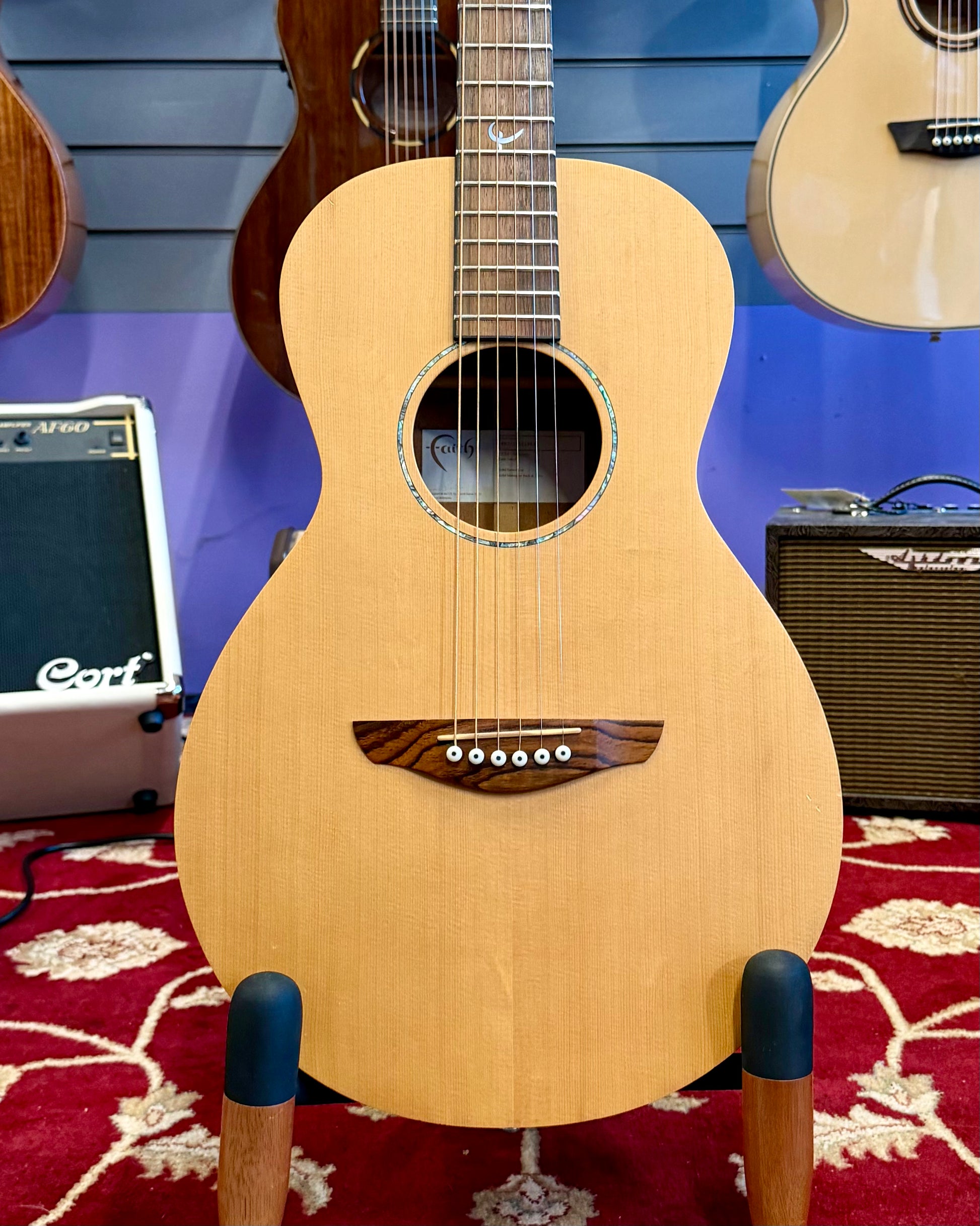 Lovely example of a Faith Mercury Parlour sized guitar from their popular Naked series. Great volume and projection and just one or two minor marks on the guitar which is very common for these ultra-thin finish guitars to pick up along the way.